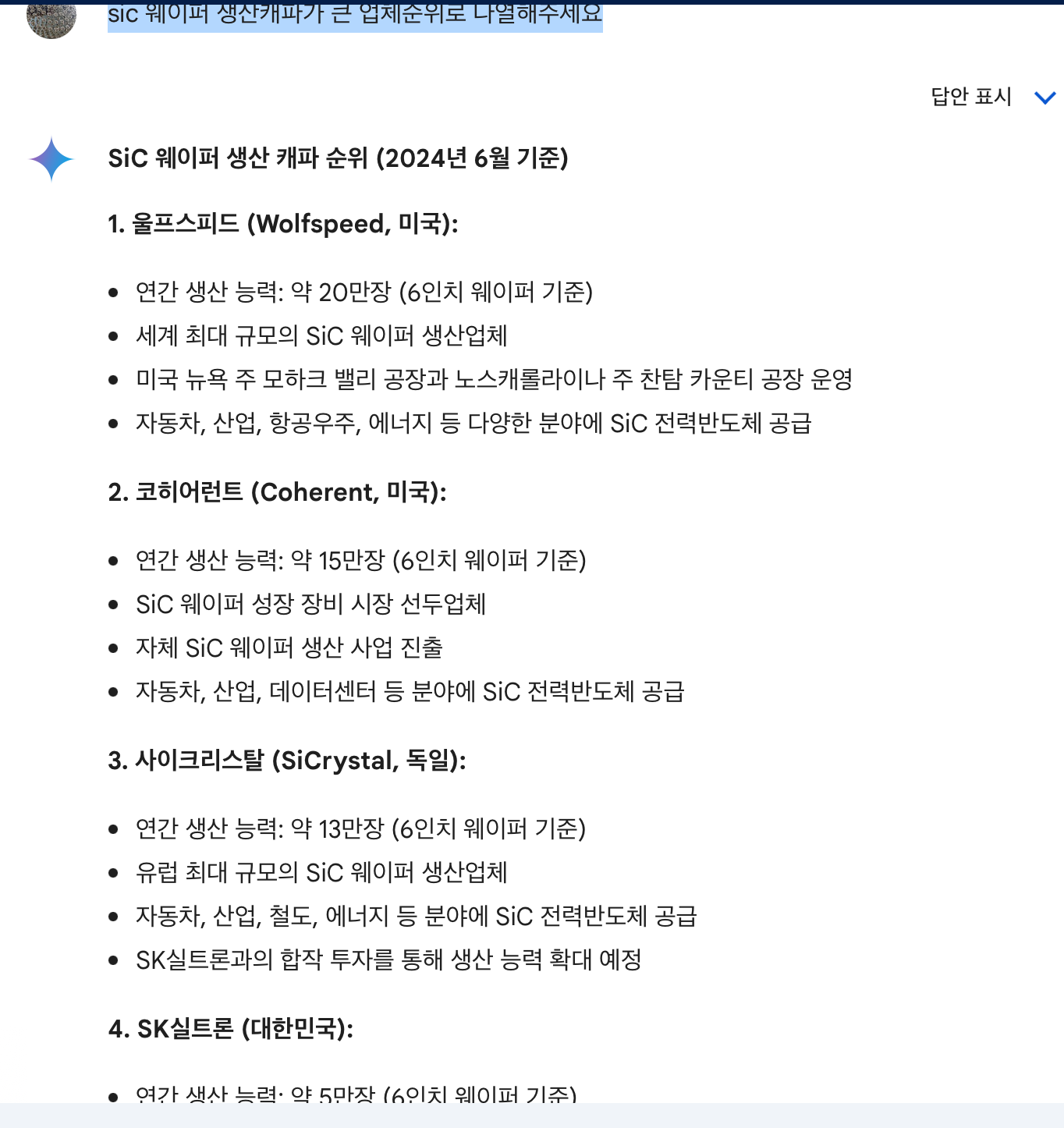 - SiC: 전력 반도체 분야에서 우수한 성능으로 빠르게 성장했습니다. 특히 전기차 보급 확대로 인해 높은 성장률을 유지하고 있습니다.
